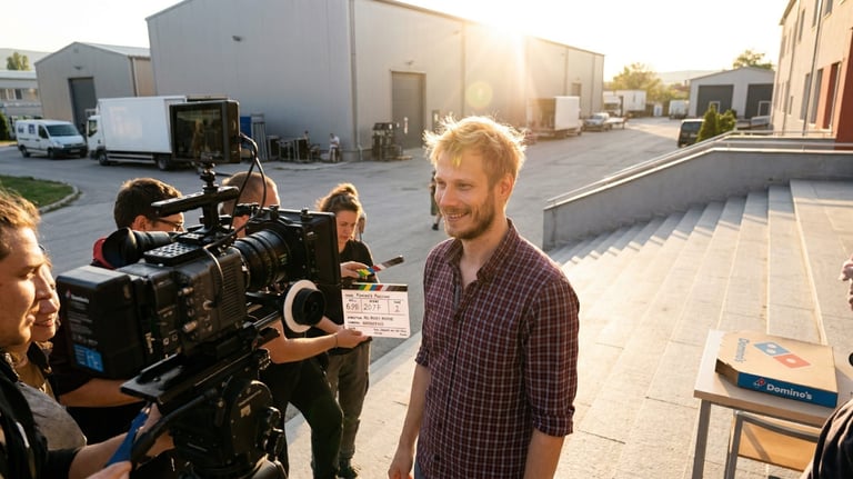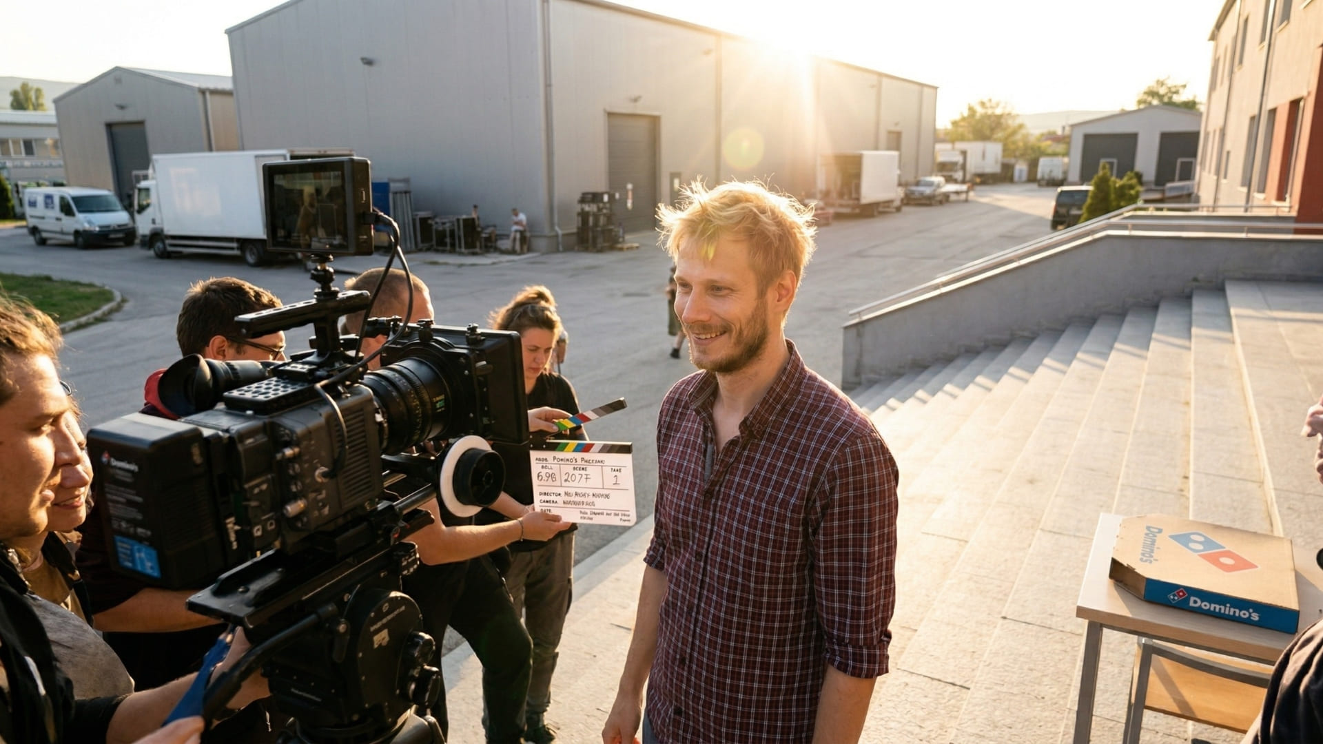 По едно време хапнахме Доминос пица - защото нищо не казва „професионален снимачен ден“ като парче пица, изядено на крак, между две чакания.